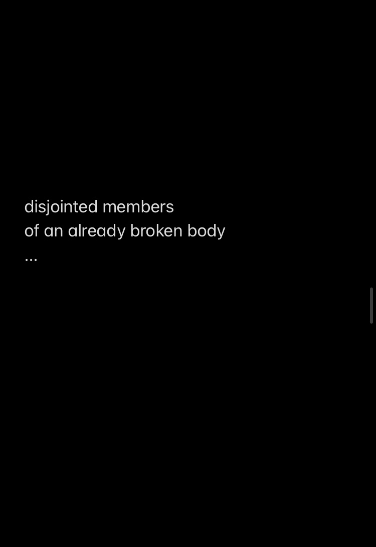 disjointed members of an already broken body now there are two does that make a communion? or are we two broken pieces that fit nowhere?