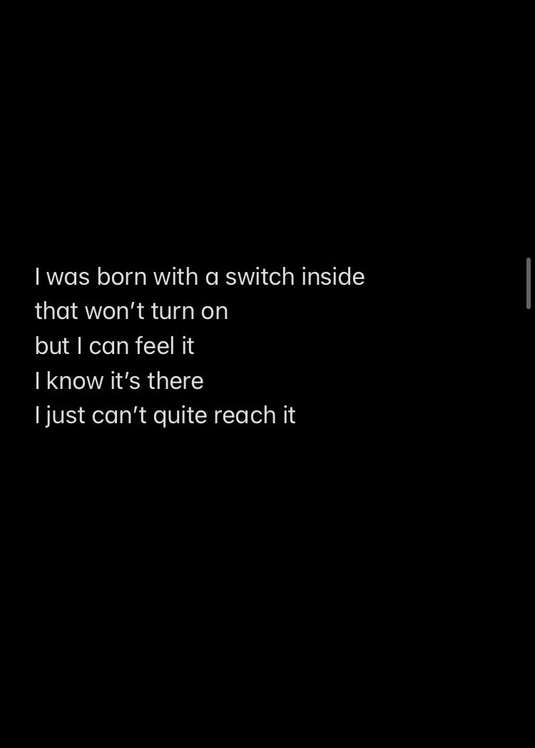 off: A Poem I was born with a switch inside that won’t turn on but I can feel it I know it’s there I just can’t quite reach it Photo by Daniel Torobekov on Pexels.com