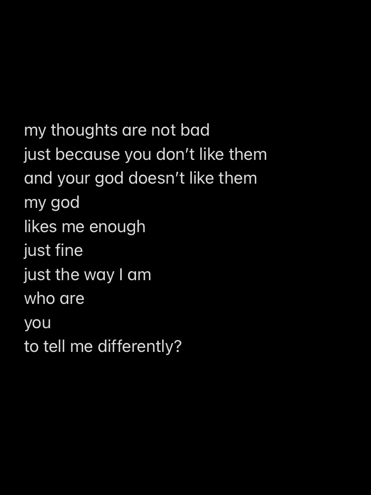 my thoughts are not bad just because you don’t like them and your god doesn’t like them my god likes me enough just fine just the way I am who are you to tell me differently?