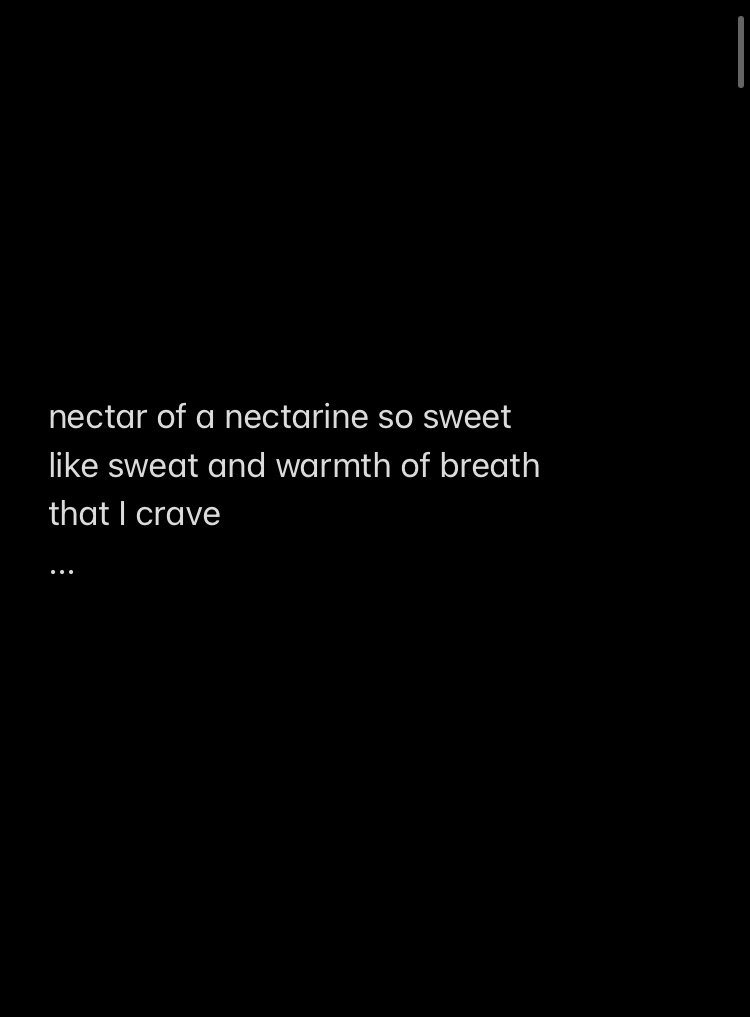 nectar of a nectarine so sweet like sweat and warmth of breath that I crave the sickly sweet and sour punch-drunk flower bright pink and red worn and stained take a taste of this punch-drunk flower and peaches a pair of peaches until this cup spills overflowing the nectar of so sweet a flower