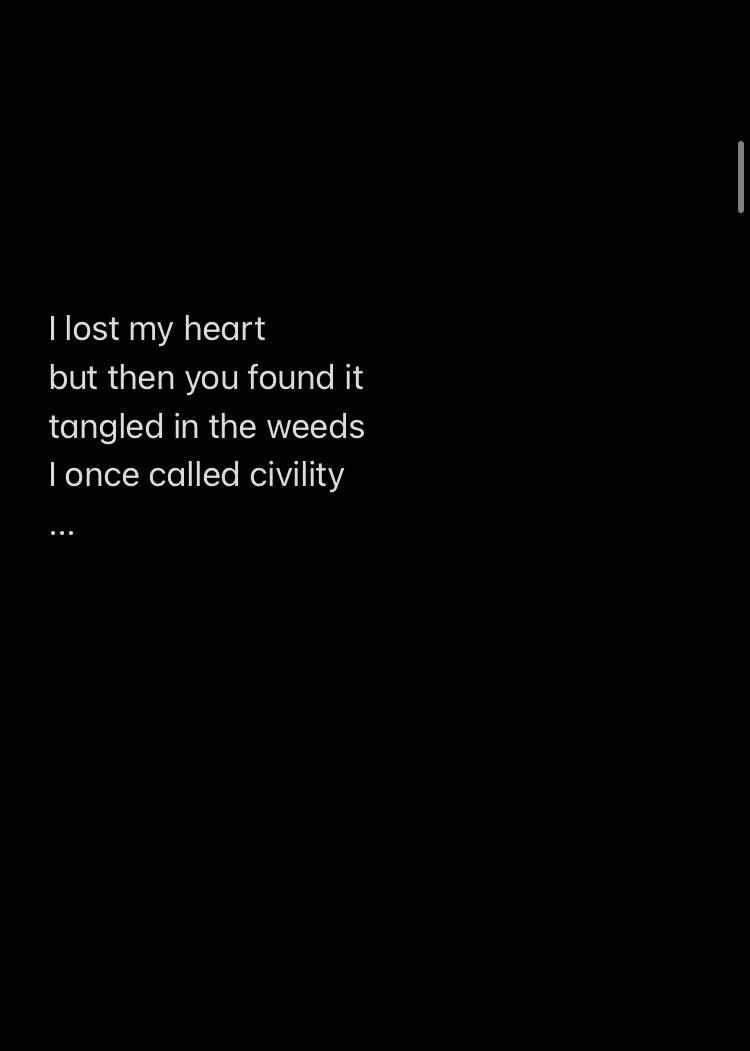 I lost my heart but then you found it tangled in the weeds I once called civility but I now know by a different name I lost my mind it’s funny how the ones who make you crazy convince you the rest of the world is insane it’s funny except no one is laughing but me because it feels so strange to think with such clarity and such calm you are my life-giving ocean washing over me keeping me safe and warm and smooth like a piece of broken glass made into something beautiful after being worn down by the waves you’ve made me a heathen in the most civil and wild way there is to be because I’ve become me and I am free