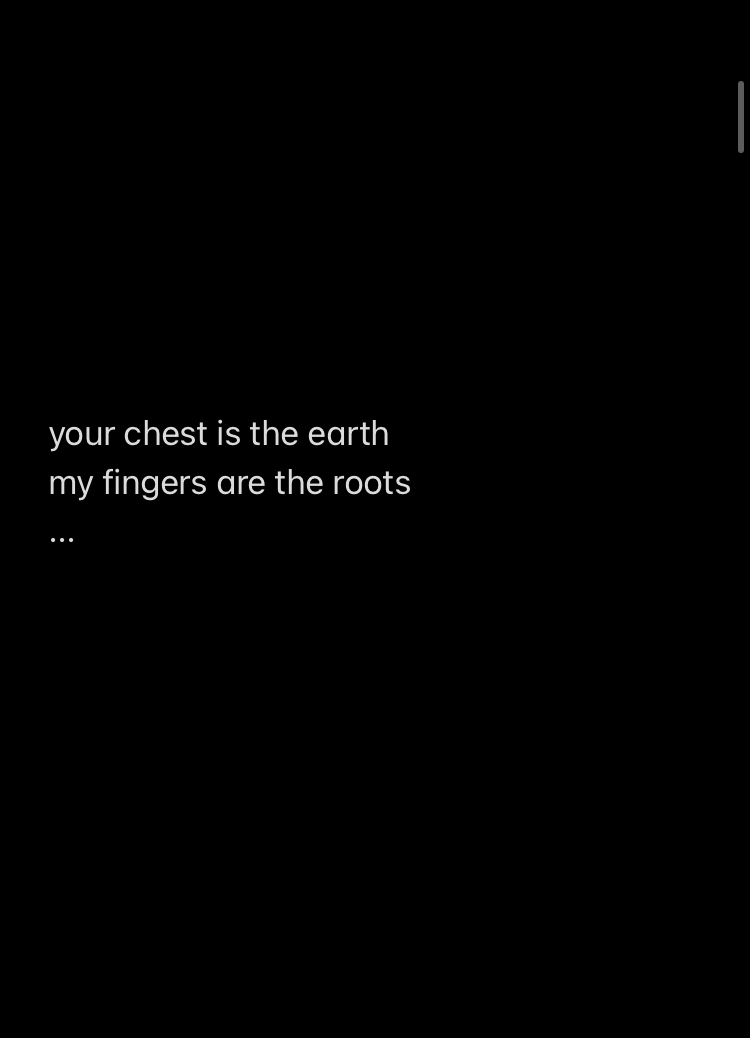 your chest is the earth my fingers are the roots your breath is the air my mouth is the ocean your cells are the creatures and my hair is the jungle we create our own world in our bed, the universe