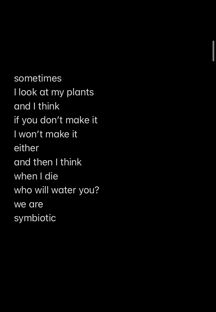 sometimes I look at my plants and I think if you don’t make it I won’t make it either and then I think when I die who will water you? we are symbiotic