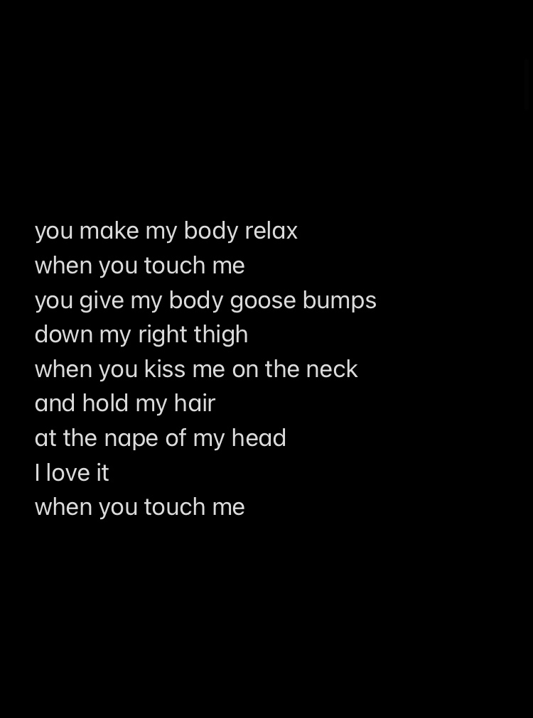 you make my body relax when you touch me you give my body goose bumps down my right thigh when you kiss me on the neck and hold my hair at the nape of my head I love it when you touch me